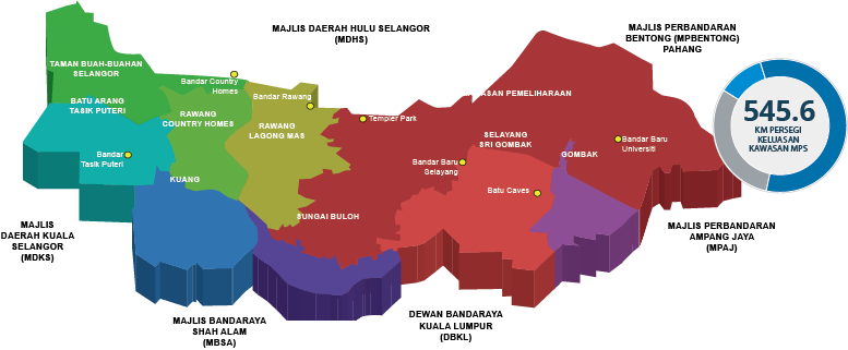 Kawasan pentadbiran Majlis Perbandaran Selayang berkeluasan sebanyak 545.6 km persegi meliputi 3 mukim iaitu Mukim Rawang, Mukim Batu dan Mukim Setapak. Ia bersempadan dengan Majlis Daerah Hulu Selangor, Majlis Bandaraya Shah Alam, Majlis Perbandaran Ampang Jaya dan Dewan Bandaraya Kuala Lumpur.